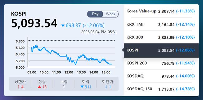 코스피 12%·코스닥 14% 동반 급락…시총 수백조 증발, 주요 대형주 일제히 급락 - 코스피 5,093.54로 698포인트 급락…거래대금 62조원, 시가총액 4,194조원 수준으로 축소 - 코스닥 978.44로 14% 폭락…에코프로·에코프로비엠 등 주요 성장주 두 자릿수 하락